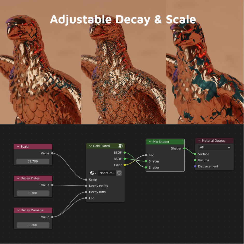 This is a procedural gold-plated material for Blender. It works best in Cycles and Eevee. With the patina and the slightly decayed look it makes it seem like the objects are already older and used. Maybe something ancient even?